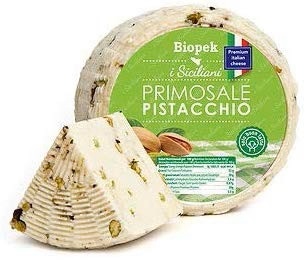 Queso pecorino fresco relleno de pistachos deshidratados y triturados. Sabor ligeramente salado.