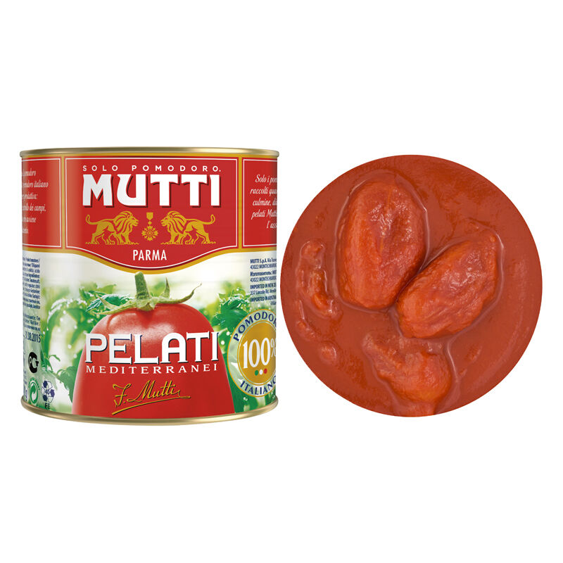 Tomates enteros italianos, pelados y sumergidos en jugo de tomate parcialmente concentrado.